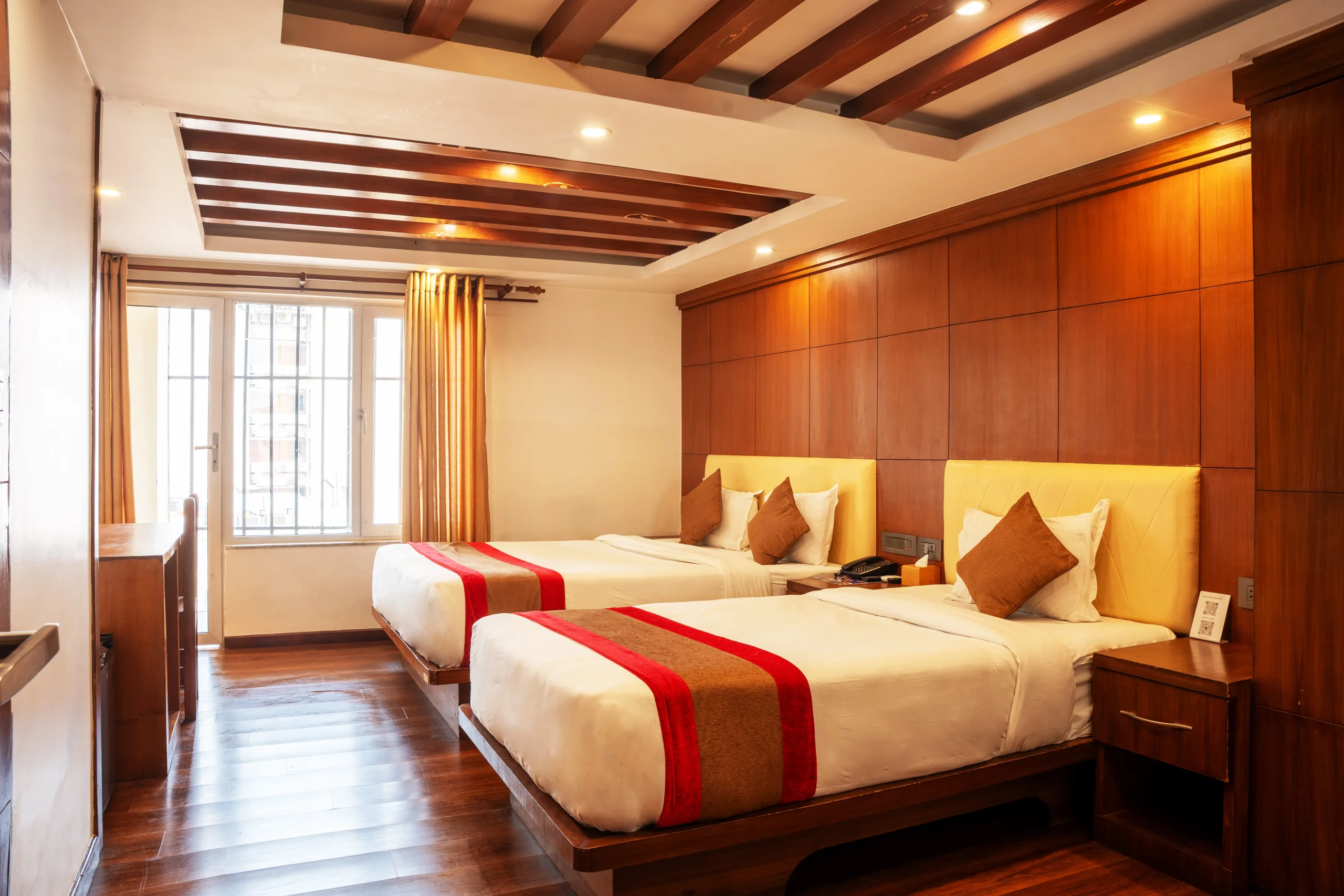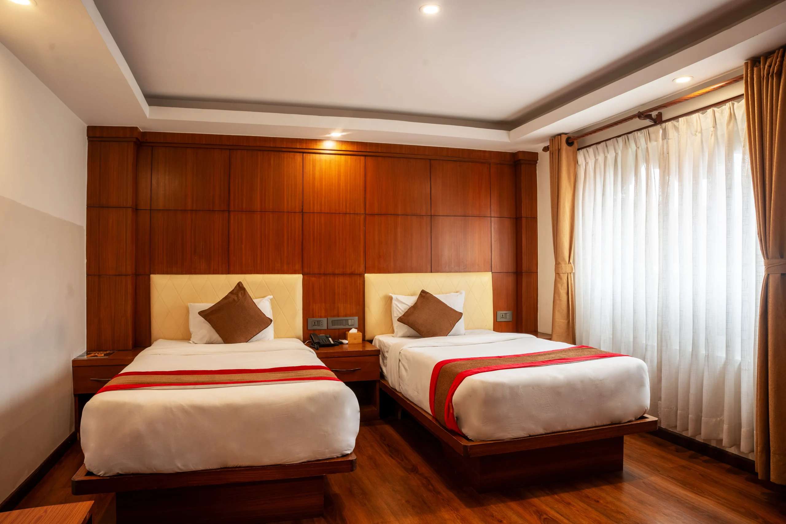 Designed for friends, colleagues, or travel partners, the Deluxe Twin Room features two comfortable single beds with premium bedding. Enjoy a relaxing stay in Thamel with all modern facilities including flat-screen TV, high-speed internet, 24-hour room service, and daily housekeeping.